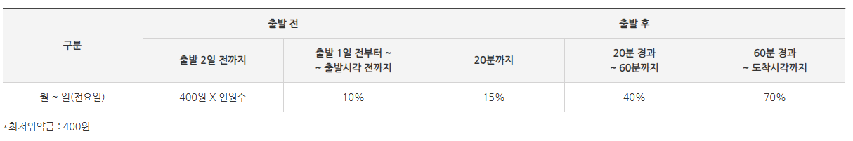 - 출발 전: 출발 2일 전까지는 인원수 x 400원, 1일 전~출발 직전까지는 10%의 수수료가 발생합니다. 단체로 예매했다면, 개별 취소가 아닌 전체 취소만 가능하다는 점도 기억해 두세요!